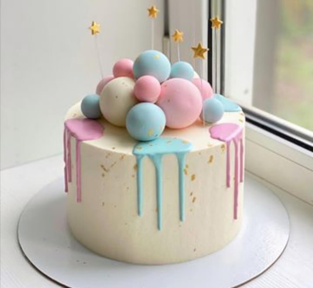 Нейтральное оформление детского тортика подойдет как и просто для праздника детворы, так и будущим родителям для раскрытия тайны пола малыша